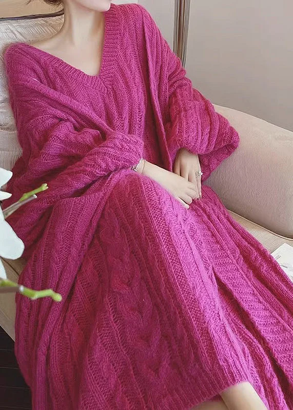 French Rose V Neck Pockets Patchwork Cotton Knit Sets 2 Pieces Fall