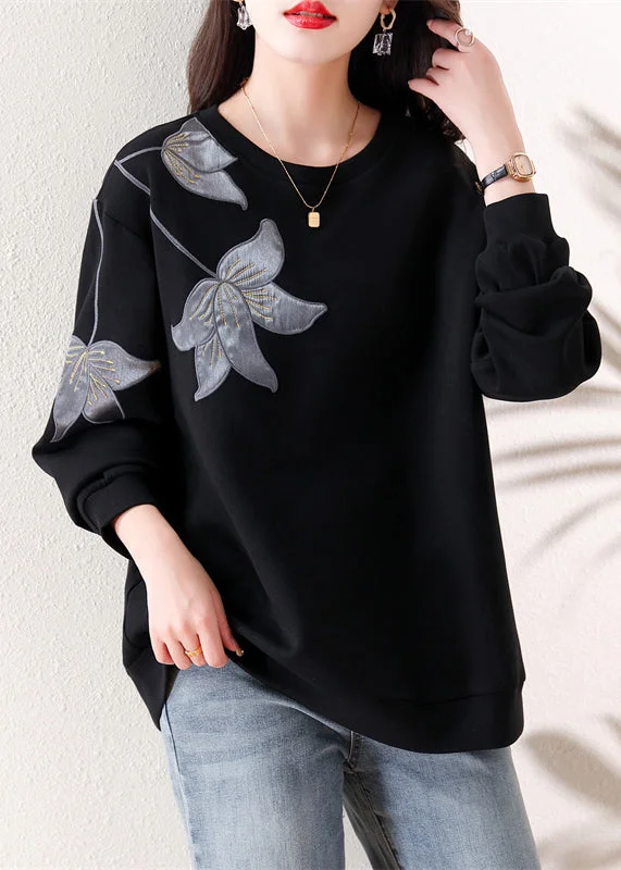 Loose Black O Neck Embroideried Patchwork Cotton Tops Fall