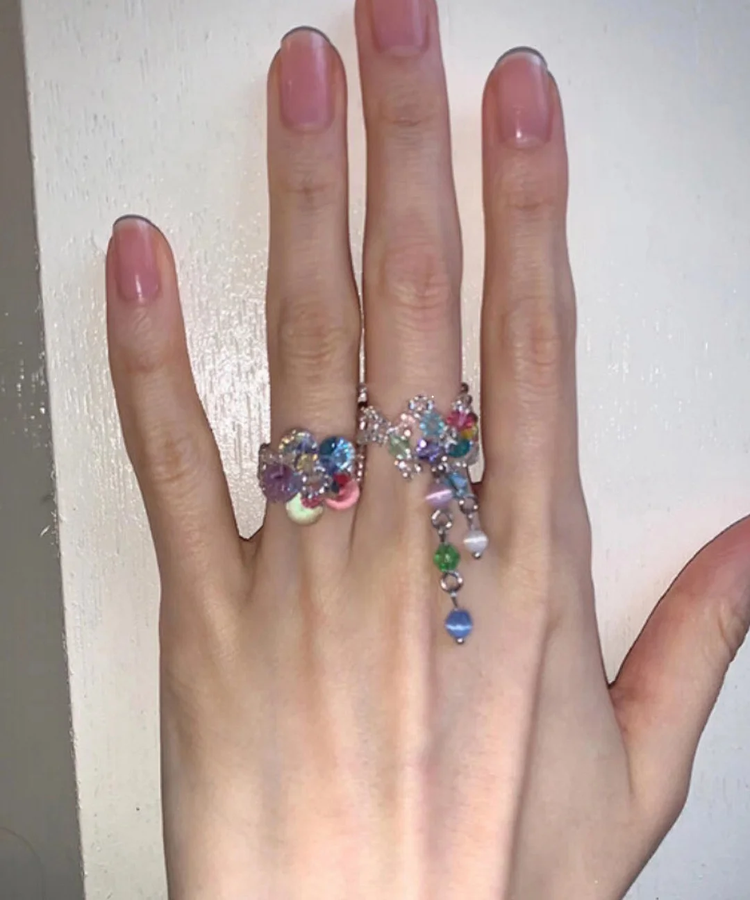 Women Rainbow Crystal Pearl Floral Tassel Rings