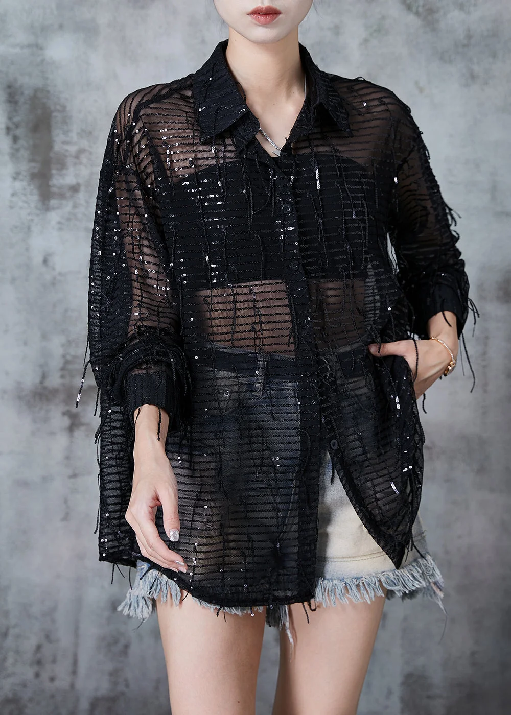 Stylish Black Tasseled Sequins Tulle Hollow Out Tops Summer