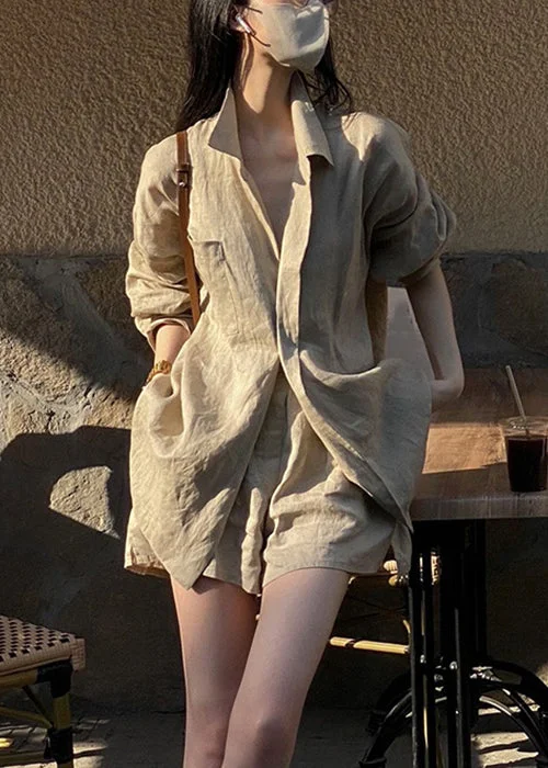 Loose Khaki Pockets Shirt And Shorts Cotton Two Pieces Set Summer
